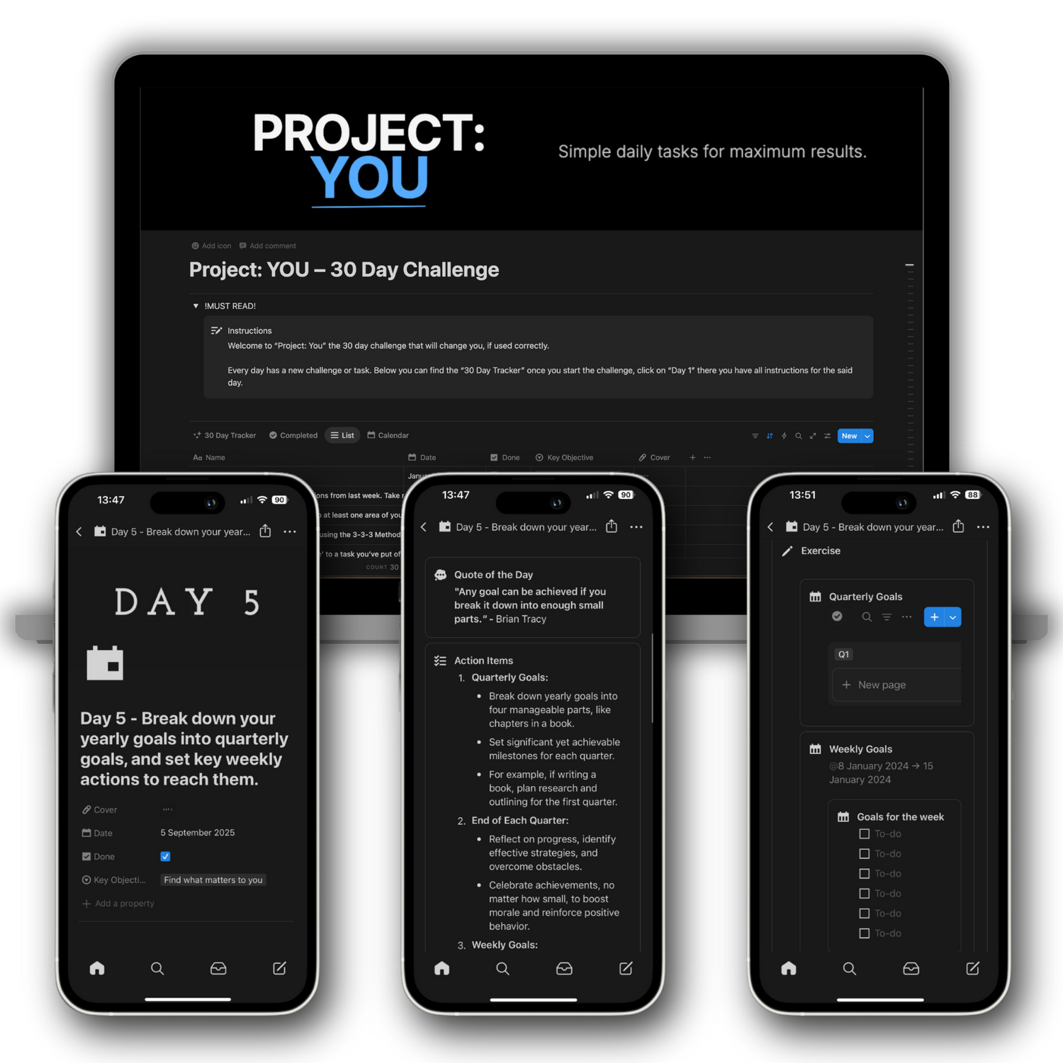 With Project: YOU, you get a ready to use Notion template which guarantees a clean structure and interface for optimal efficiency and growth.
